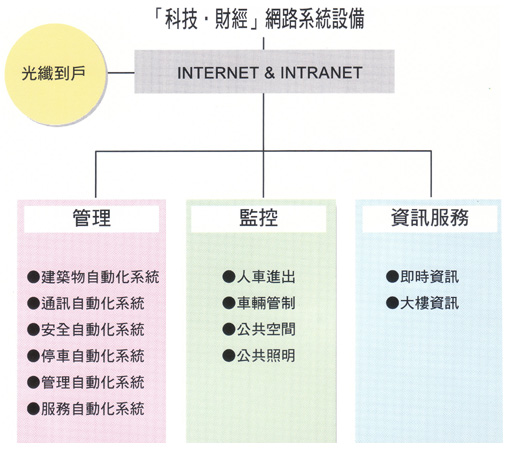 淘汰傳統平面式監控系統,讓大樓的安全管理全面立體化,整合全棟建築之管理、監控和通訊系統,結合被動式數位錄影系統、異常狀況自動偵測警報系統,透過單一作業系統即可完成,保全人員無須24小時緊守監視器,甚至可透過INTERNET遠距離操控,即使出國亦可監看辦公室狀況。經由此系統,亦可將國內外最新資訊公佈於大樓電子布告欄或直接有效顯現至各用戶的電腦中,資源有效整合、提升管理品質。 |